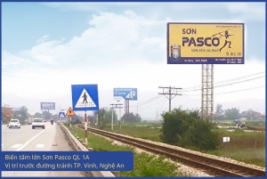 Không chỉ triển khai mở rộng thị trường, tìm kiếm nhà phân phối mới, Sơn Pasco còn đầu tư mạnh về truyền thông tại địa phương, cụ thể là đặt biển trụ cột, tấm lớn trực tiếp trên QL 1A - Vị trí trước đường tránh TP. Vinh, Nghệ An.